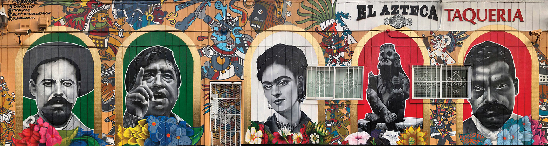 The Azteca Taqueria Resturant owner walked up to me while I was painting the Dharma mural and we struck a conversation about a possible mural. We eventually made an appointment to come see his wall, a Taqueira Business on 3rd and Williams Street in San Francisco. The mural was a huge success where people from all over social economic backgrounds came together to symbolize pride and respect in the neighborhood. From L to R: Francisco Poncho Villa, Caesar Chavez, Frita Kahlo, Xochilpilli (God of Art), Emiliano Zapata Salazar.